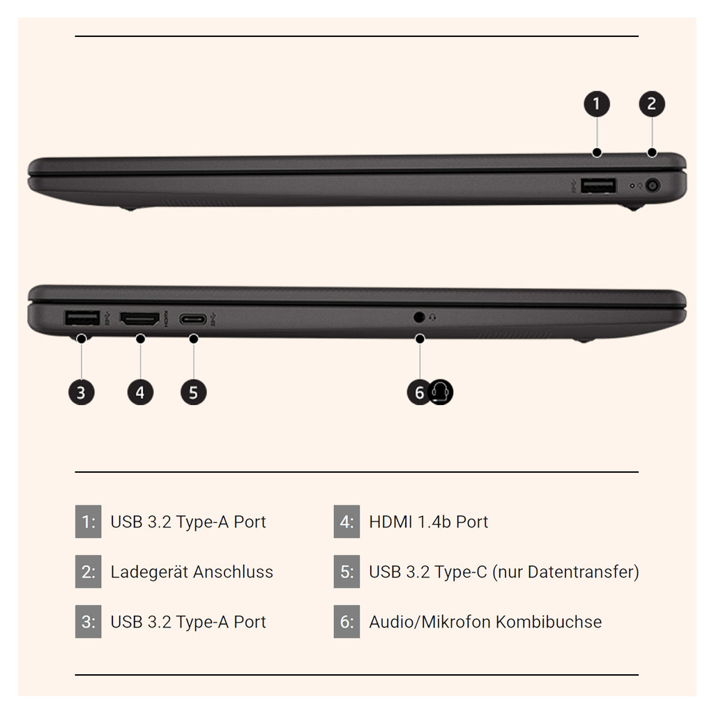 Dank der USB-Anschlüsse (zwei USB 3.2 Type-A und ein USB 3.2 Type-C Ports für schnellen Datentransfer) überträgst du Daten von deiner Kamera oder USB-Sticks schnell und zuverlässig auf das Notebook.