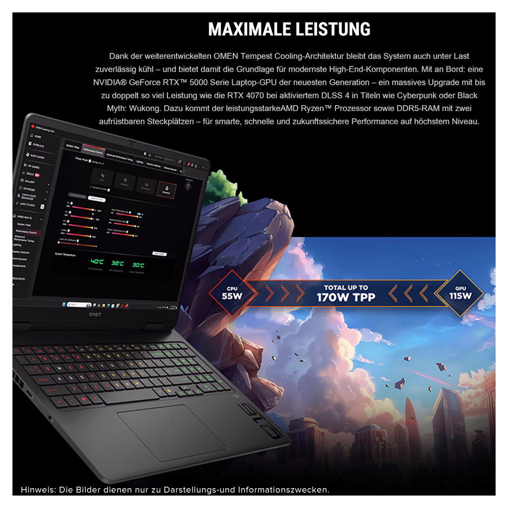 Der OMEN Gaming Laptop bietet neueste drahtlose Technologien, darunter Wi-Fi 6, sowie umfangreiche Schnittstellen für externe Geräte. Die vielfältigen Anschlussoptionen sorgen dafür, dass man stets bestens vernetzt ist, egal ob beim Online-Gaming, Video-Streaming oder produktiven Arbeiten.