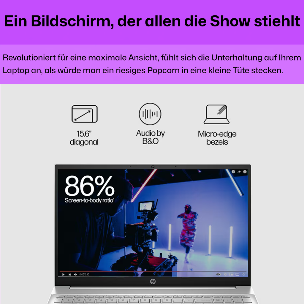 Dank des Designs mit neuer, schmaler Bildschirmblende ist dies das kompakteste Pavilion-Notebook aller Zeiten. Eineglatte Metalloberfläche verleiht diesem Notebook ein prägnantes, edles Aussehen – von der geneigten Tastatur bis hin zum kühnen Design ist jedes Detail auf Komfort und Stil ausgerichtet.