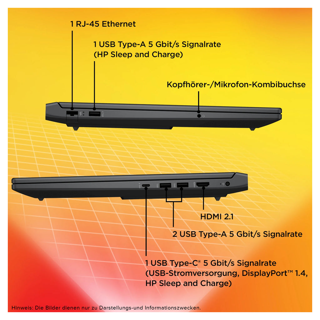 Das HP Gaming-Notebook besitzt zwei USB 3.2 Anschlüsse und einen USB 3.2 Type-C Port, die einen schnellen Datenaustausch mit externen Datenträgern oder den Anschluss von Zubehör ermöglichen. Über eine HDMI-Schnittstelle kann ein exgerner Bildschirm oder ein Fernseher angeschlossen werden.
