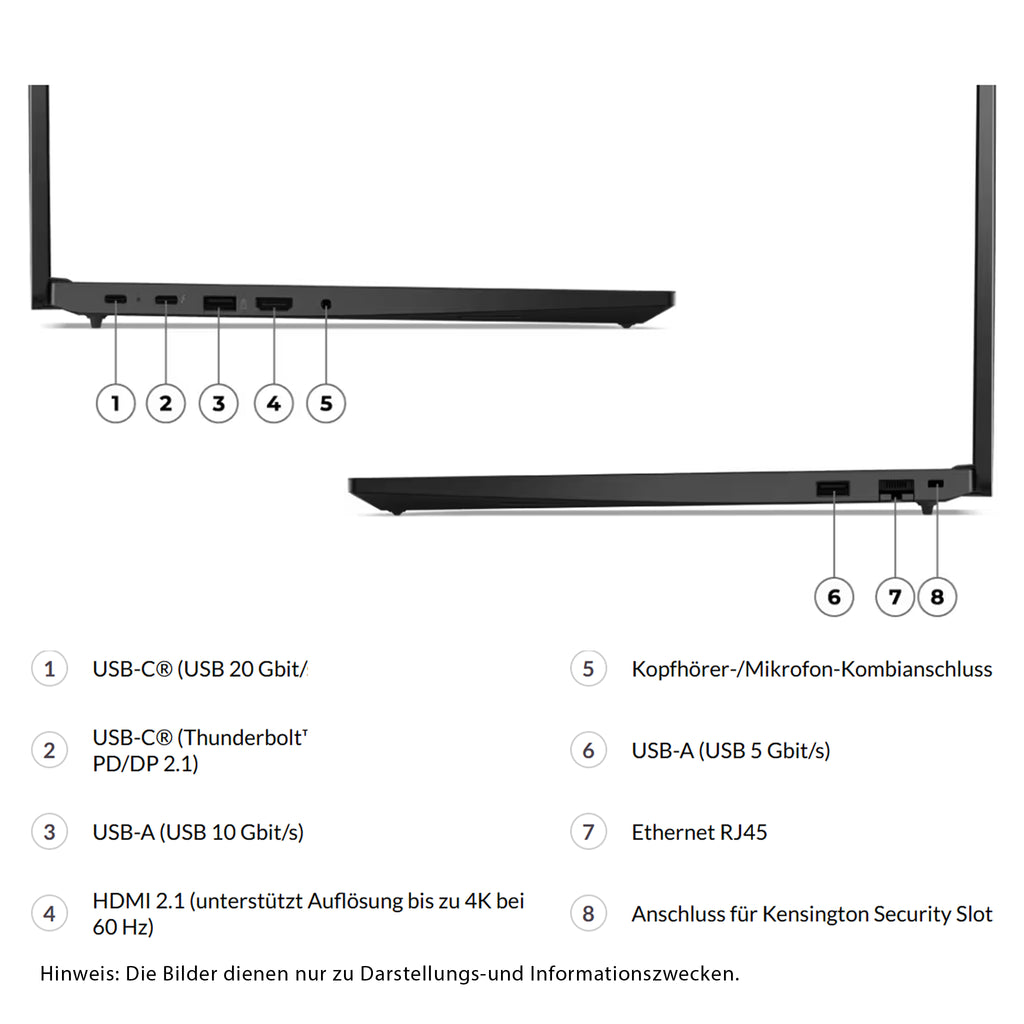 Mit vielseitigen Anschlussmöglichkeiten – darunter USB-Typ-C und klassischen USB-Ports – lässt sich das ThinkPad problemlos mit externen Monitoren, Speichermedien oder Peripheriegeräten verbinden. Zusätzlich sorgt Gigabit-Ethernet für stabile Netzwerkverbindungen bei Bedarf.